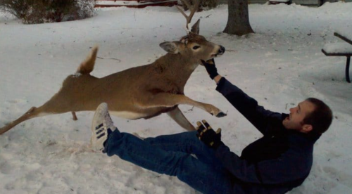 We stopped cold, and I got a really bad feeling. I had heard about deer during the rut. I had always laughed when I heard someone had been killed in a deer attack because I didn’t believe it. For those of you not versed in the world of hunting, the rut is when the boy deer (buck) try to get busy with the girl deer (doe). The buck tries to gather as many does as he can (sort of like a deer harem), and then he gets all mean and fighty with any bucks who try to hone in on his territory. Love does crazy things to everyone—including bucks, who have been known to attack people, dogs, and anything else they may see as a threat.